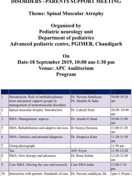 SMA clinic on 19th Sept 2019, from 9.30am to 1.30pm in PGI Chandigarh